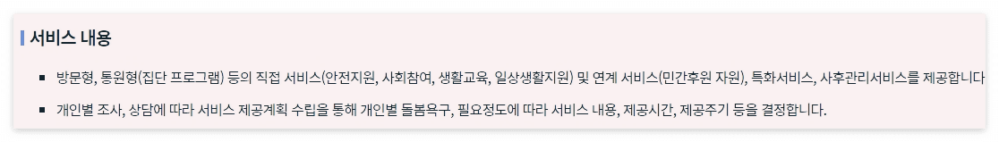 - 일상생활지원: 대상자의 일상생활을 지원하기 위하여 외출동행, 가사지원을 제공하는 서비스