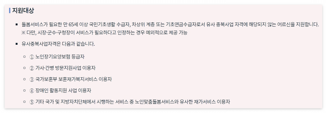 돌봄서비스가 필요한 만 65세 이상 국민기초생활 수급자, 차상위 계층 또는 기초연금 수급자로서 유사 중복사업 자격에 대항되지 않는 어르신을 지원합니다. 유사중복사업자격은 위의 내용을 확인해 주세요.